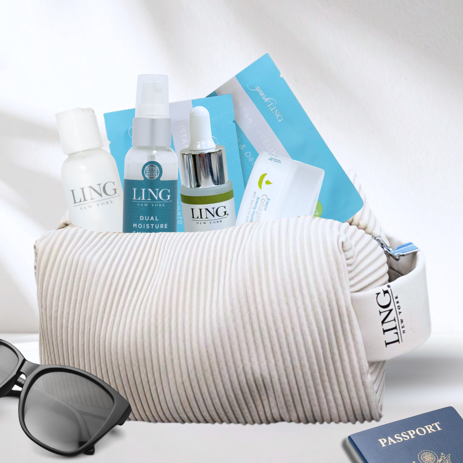 On the go? Your glow doesn’t have to wait. Each kit is packed with LING’s most-loved essentials in travel-ready minis!